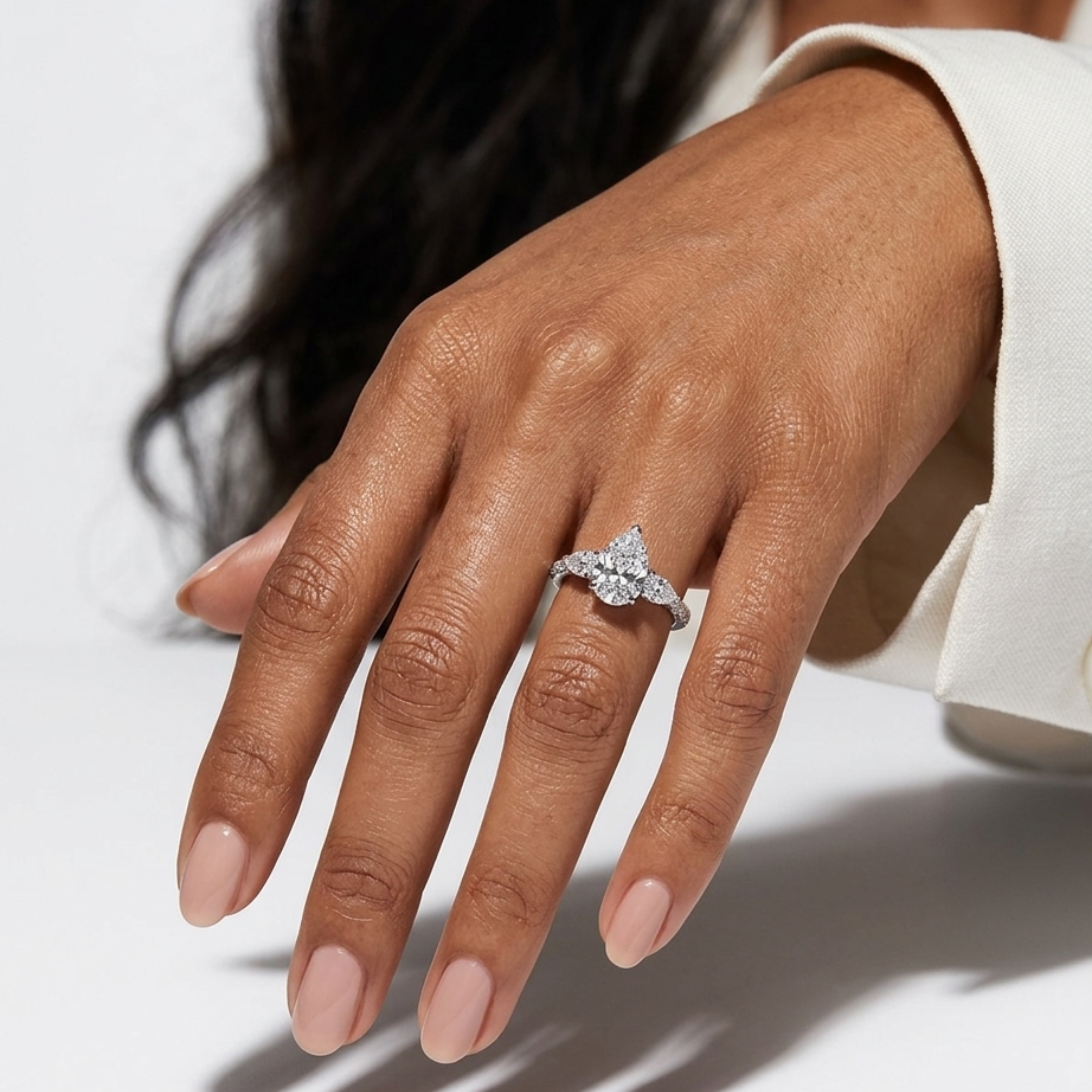 A timeless design with a regal presence, the Royale Cushion Diamond Ring is crafted to make a lasting impression. At its center sits a striking cushion cut diamond, framed by elegant pear shaped side stones that enhance its brilliance with graceful balance and refined symmetry.